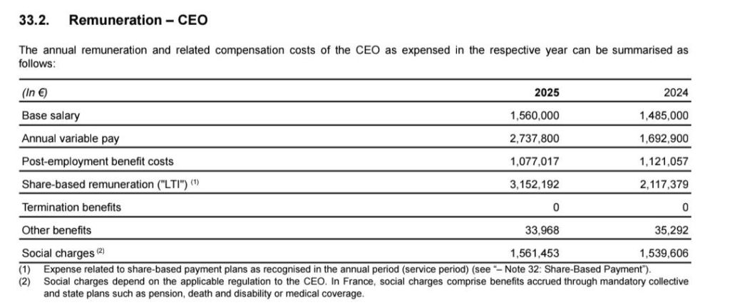 Faury had his base salary frozen in relation to 2024 at 1.485M€ (which is lower than Enders’ one at 1.5 M€ in 2017). Variable pay decreased in 13% to 1.69M€, post-employment benefit costs increased, as did share-based remuneration and social charges. In comparison to 2017, the main changes are the following two: 1) that there are no “Termination benefits” in 2024 while in 2017 Enders had announced his departure in 2019, thus the concept included 2.9M€, and 2) the exponential increase of social charges, 1.5M€ in 2024 vs 12k€ in 2017. Thus, the overall compensation at 7.99M€ increased vs 2023 but is below 2017 level (9.1 M€).