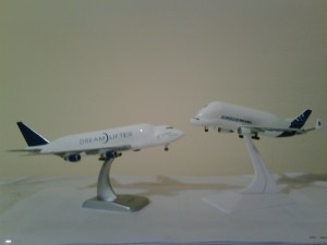 While looking at the small-scale models of aircraft at home, some days ago, I locked on the Beluga and the Dreamlifter (Airbus and Boeing transport aircraft to bring major components from one factory to another). I had become used to the sight of the Beluga but seeing then both together I realized that they are indeed bizarre.