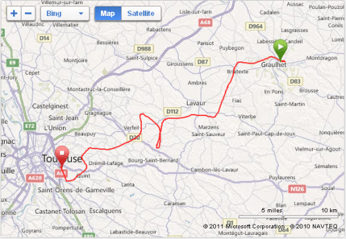 You may see the route we followed from Graulhet (LFCQ) to Toulouse-Lasbordes (LFCL) aboard the Robin DR-42 (F-GORM), as I recorded it with my Garmin GPS: