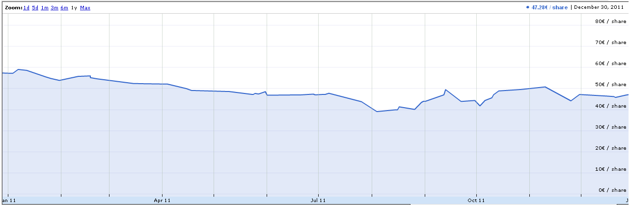 Let’s start with the humbling exercise :-). I had taken along the year above 50 samples, so we could get an idea of how the fund evolved. As you may see in the graphic below, the net asset value per share at the beginning of 2011 was 57.19€ while at the end it fell to 47.28€, that is -17.3%. This was the performance of the fund in 2011 (not good enough to sell subscriptions to the fund! :-)).