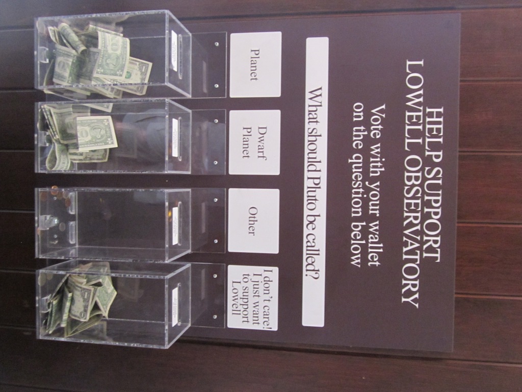 Finally, we found it funny this humourous touch we found at the museum: at the time of asking for support for the observatory, 4 different boxes are presented to the visitor enabling her to vote with the wallet on “What should Pluto be called?” (2):