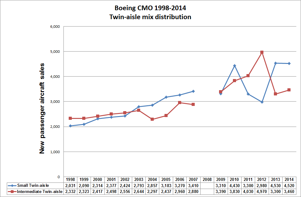 Last year I wrote a post showing the puzzling change in Boeing’s predicted mix of twin-aisle sales, between small and medium wide-bodies (“Wide-body mix in 15 years of Boeing CMOs”). A few days ago I wrote a post about the publishing by Boeing of its Current Market Outlook for 2014-2033. This year’s CMO is more consistent with last years figures, i.e., the larger share of the forecasted market corresponds to small wide-bodies (787s from Boeing perspective). Recall the numbers:
