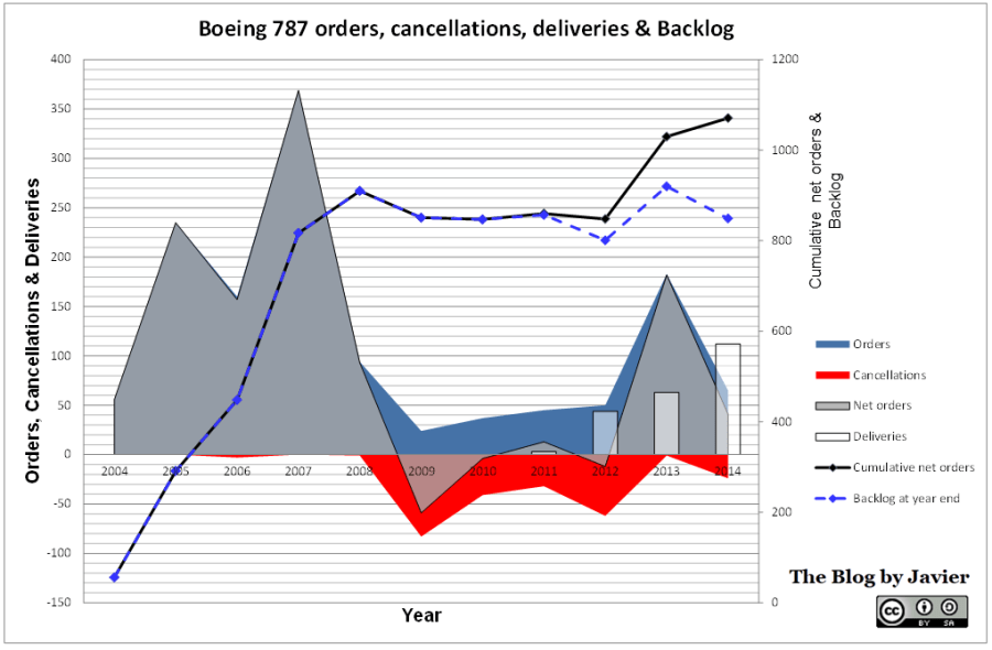 Boeing 787 orders, cancellations, deliveries & backlog through 2014