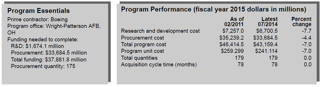The program performance review that the GAO makes is seen from the Air Force point of view, which, as indicated above, since the contract is a FPIF, the USAF feels protected and thus it does not show any sign of the 1.5bn$ over cost that Bloomberg mentions that Boeing will have to bear: