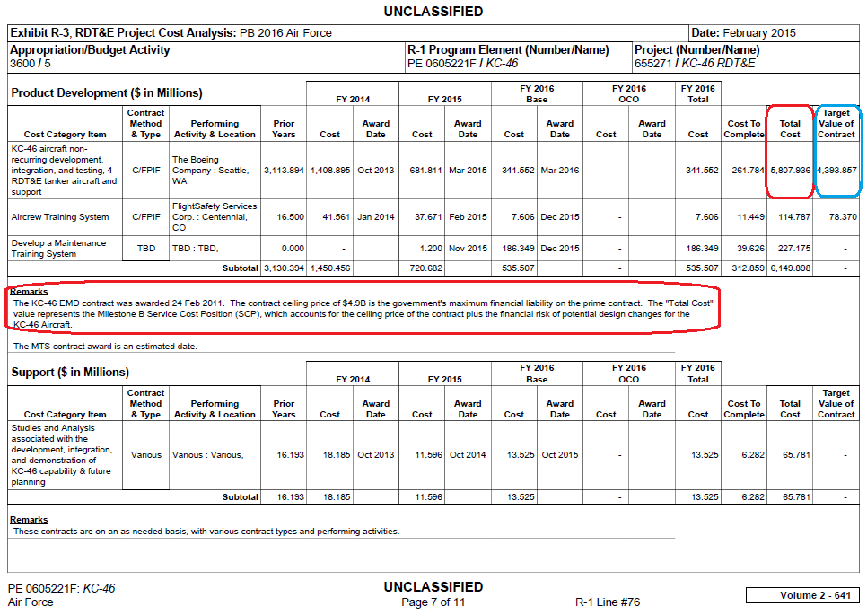The contract ceiling price of $4.9B is the government’s maximum financial liability on the prime contract. The “Total Cost” value represents the Milestone B Service Cost Position (SCP), which accounts for the ceiling price of the contract plus the financial risk of potential design changes for the KC-46 Aircraft