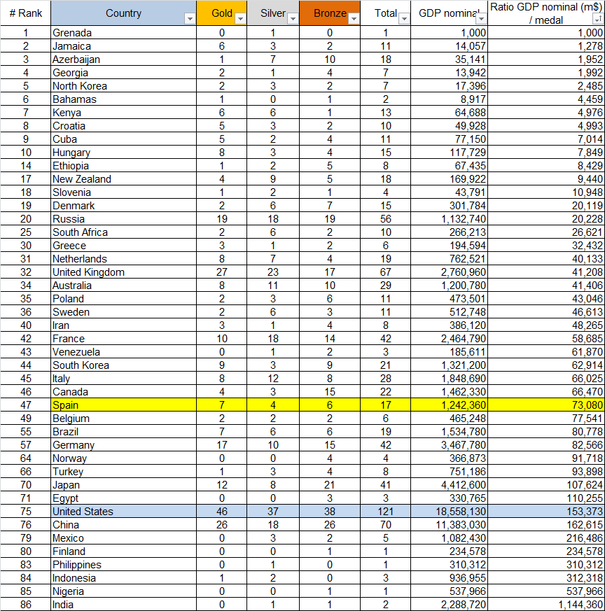 Rio 2016 – ratio nominal GDP medal table 2016.08.21 selection