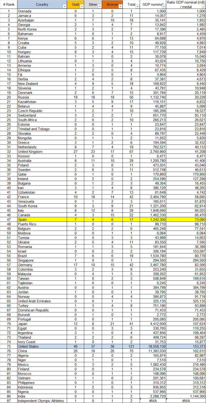 2016 Olympic Games medal table vs. population and GDP