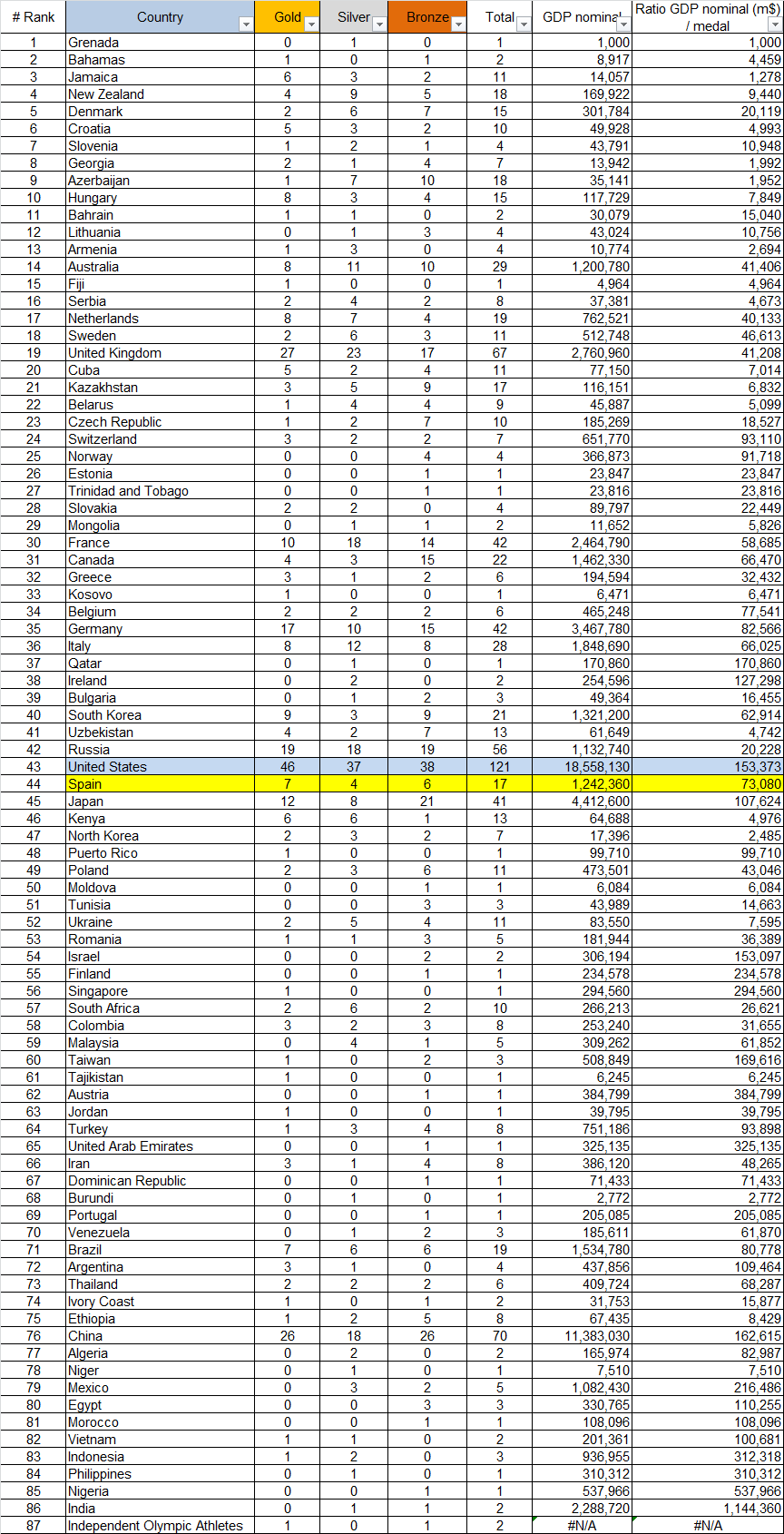 Rio 2016 – ratio nominal GDP medal table 2016.08.21 TOTAL