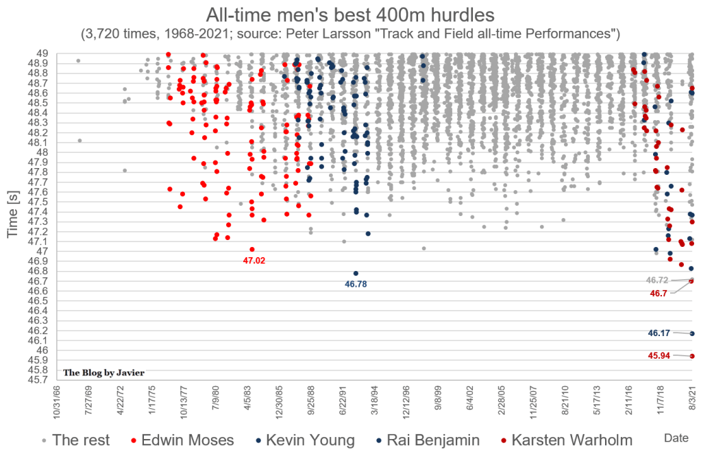 With the data of all-time men’s best 400m hurdles times I plotted the chart below with the best 3,720 times (times below 49 seconds) and their dates, highlighting the times by Edwin Moses (the legend champion from the 1970s and 1980s, when he won the gold medal in two Olympics and two World championships, set the world record twice, and went unbeaten for a whole decade between 1977 and 1987 winning 107 competitions and 122 races in a row), Kevin Young (who won the event in the Olympic Games of 1992 establishing a new world record and being the first person to run the distance below 47 seconds, a record that held until a month ago), Rai Benjamin and Karsten Warholm.
