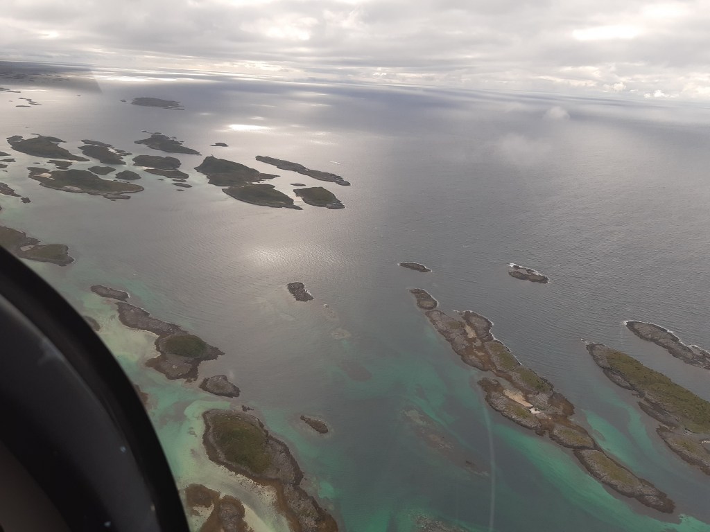 After 1h30′ the sky became somewhat clearer and just when we were going to fly West of Andenes airport we received a message from the F-BERB informing that the weather by the interior of the Lofoten islands was better and we could see some light from afar at that point so we changed plans and took heading for Evenes airport. We then enjoyed an hour of very pleasant flight over the islands and turquoise waters.