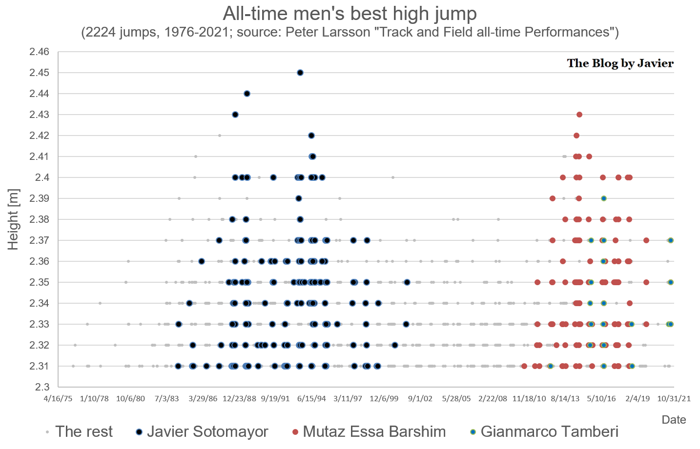 With the data of all-time men’s best high jumps I plotted the chart below with the best 2,224 jumps (jumps from 2.31m and above) and their dates, highlighting the jumps by Javier Sotomayor (who still holds the record), Barshim and Tamberi.