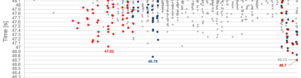 With the data of all-time men’s best 400m hurdles times I plotted the chart below with the best 3,720 times (times below 49 seconds) and their dates, highlighting the times by Edwin Moses (the legend champion from the 1970s and 1980s, when he won the gold medal in two Olympics and two World championships, set the world record twice, and went unbeaten for a whole decade between 1977 and 1987 winning 107 competitions and 122 races in a row), Kevin Young (who won the event in the Olympic Games of 1992 establishing a new world record and being the first person to run the distance below 47 seconds, a record that held until a month ago), Rai Benjamin and Karsten Warholm.