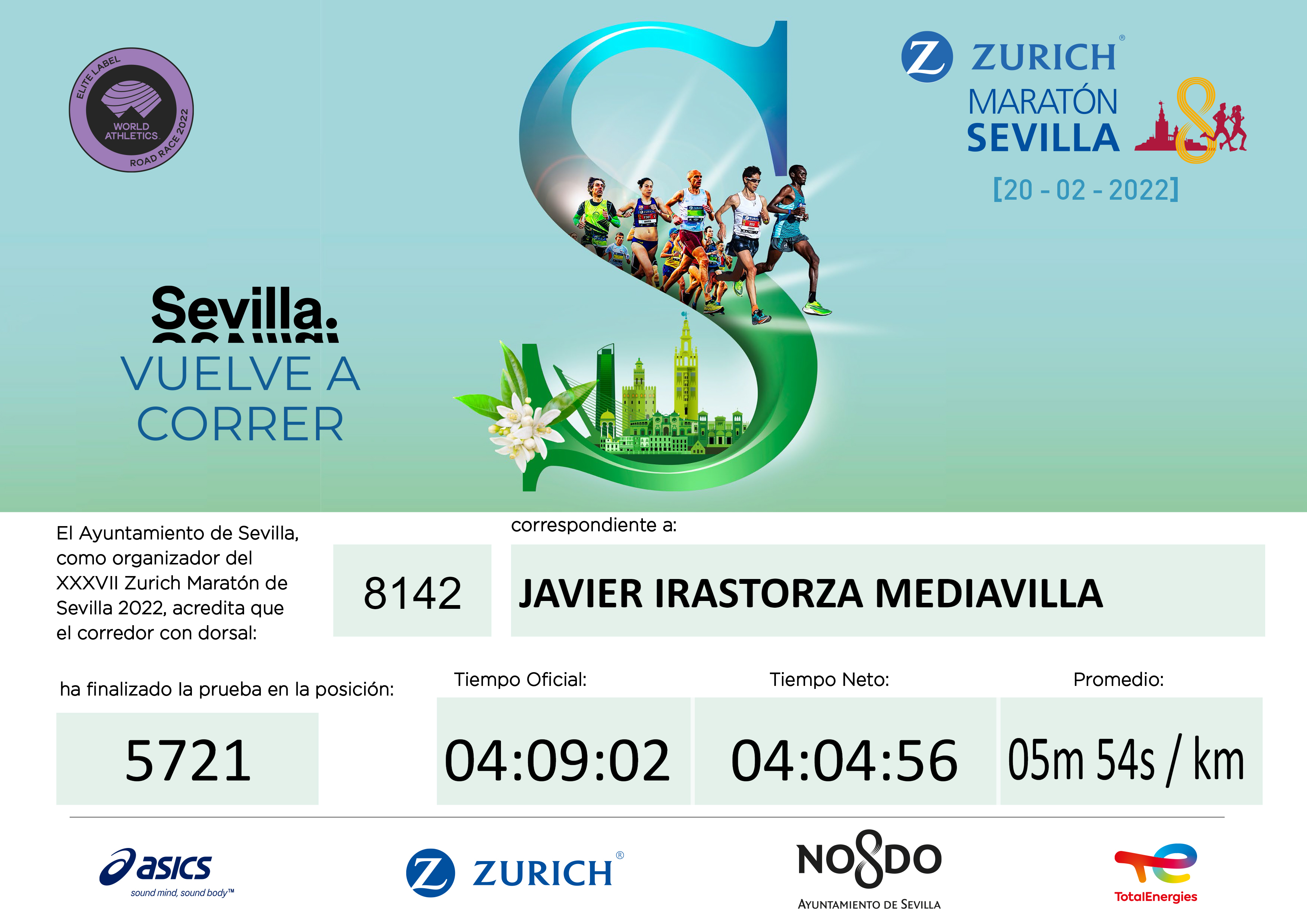 In the end, I clocked a net time of 4h04’56”, a time better than what I expected (~4h15′). Sevilla 2022 was my 22nd marathon completed, easy to say today but not so on April 30th 2000 when I completed my first one in Madrid.