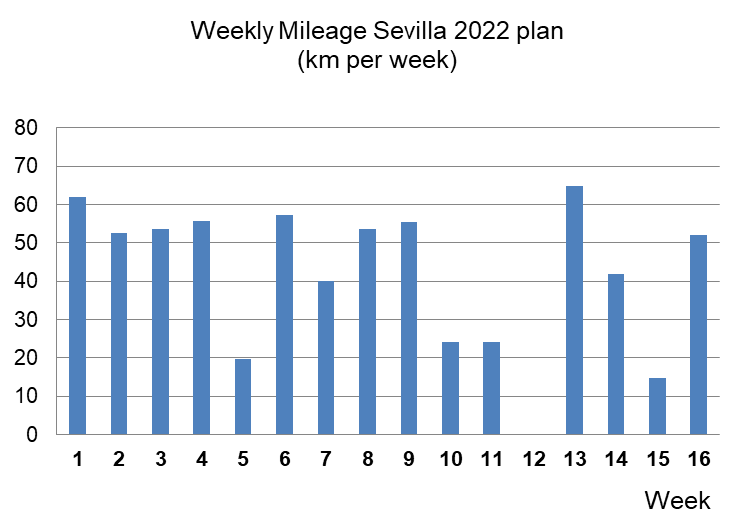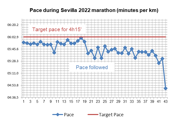 To prepare for this marathon I followed the same 16-week training plan I had used in the past. I arrived to Sevilla with more mileage (629km) in the legs than in the case of the last few marathons. I trained quite well in November, December and the first week of January. Then, I caught Covid-19 and had to stop running for about 10 days. During the last two weeks of the plan, with workload and work-related travel, I found it difficult to train, but most of the training was already done. In those 16 weeks I averaged over 41km per week, completed 5 long runs (of over 21km, twice 23km, 27km and 30km) and a few sessions of series, though not enough of them to get a bit faster. The negative note was that in the last long run over 21km (just two weeks before the race) I finished very weak and with bad feelings for the race in terms of targeting a pace at or below 4 hours, but still with the confidence of being able to finish it even if the final time was uncertain.