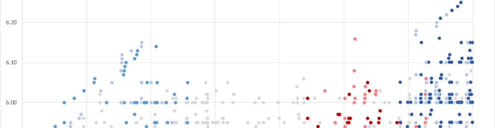With the data of all-time men’s best pole vault I plotted the chart below with the best 4,022 jumps (jumps from 5.80m and above) and their dates, highlighting the jumps by Sergey Bubka, Renaud Lavillenie and Duplantis (dark colour for outdoor vaulting, light colour for indoor).