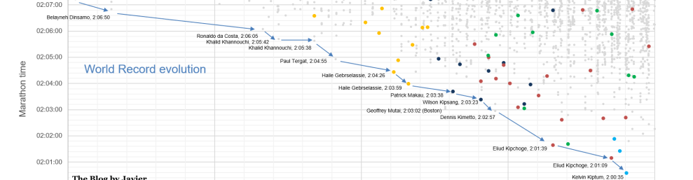 With the data of all-time best men’s marathon I plotted the chart below with the best 1,903 times, i.e., all those below 2h08′ and their dates, highlighting marathon times by Haile Gebrselassie, Wilson Kipsang, Eliud Kipchoge, Kenenisa Bekele and Kelvin Kiptum.