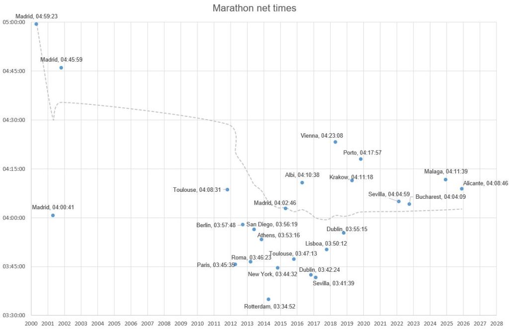 In the end, I clocked a net time of 4h08’46”, a time about what I expected given the weight with which I arrived at the race and the incomplete training that I followed, even nearly 3 minutes faster than the last marathon (Málaga). This has been my 25th marathon completed, easy to say today but not so on April 30th 2000 when I started in the distance in Madrid.