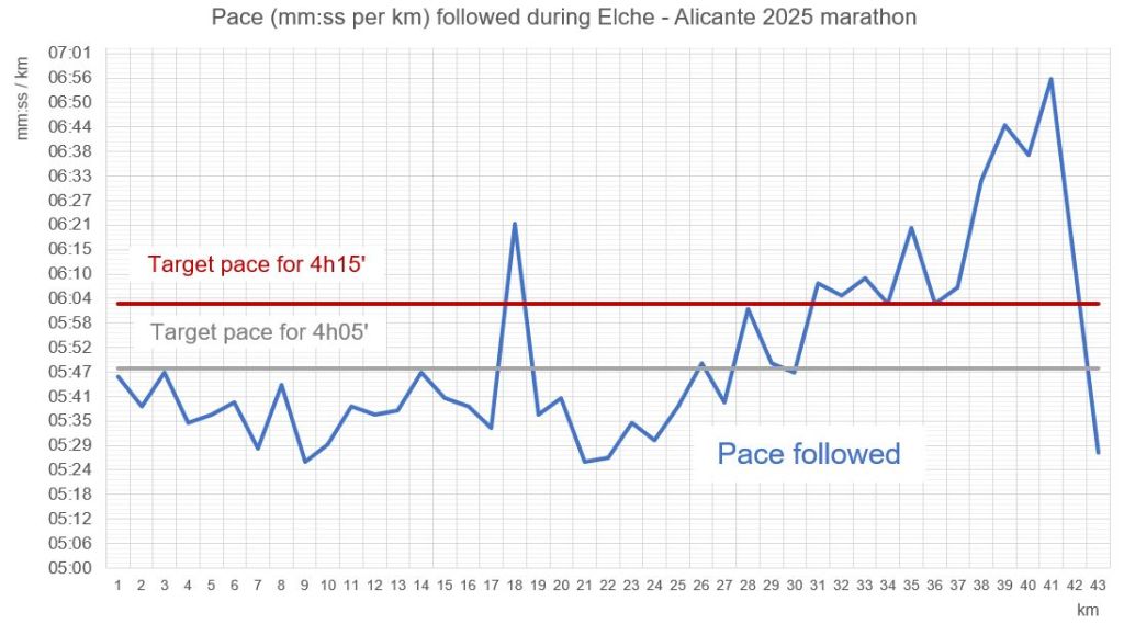 The temperature was a bit fresh in the morning (~8°C), the sky was clear and it would be a bit warmer towards the end of the race, though the temperature did not exceed 19°C. My strategy was to start at a pace just below 6min per km, and then, if I felt well, accelerate a bit after some kilometres to build up some margin during the descent part of the circuit so that I could target a time below 4h15′. There were pacers for times aiming at every 15-minute mark and I started a bit behind the 4-hour pacers, which I kept at a short distance until the km 25.