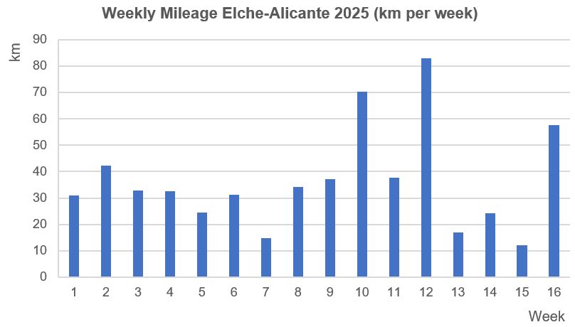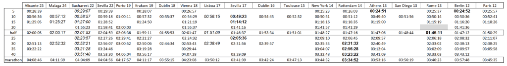 To prepare for this marathon I followed the same 16-week training plan I had used in the past. I started with the plan in mid August during our holidays in Italy. In the end I arrived to Alicante with 540km in the legs in those 16 weeks, a bit less than I would have liked. For some months I felt the Achilles tendon of the left leg a bit sensitive, hence I decided to run a moderate weekly mileage for over a month before starting with the long runs. I also chose to skip the series training, as being overweight (94kg the day after the race), the series would hurt the tendon. By mid October I started to run some long runs. Not many though, just 3 over 20km: 27km, 30km and 30km. I then had some business travel during which I managed to run some days even if on the treadmill. With that training behind and the experience of the last 3 marathons I was somewhat confident in being able to complete the marathon in a time between 4h05′ and 4h15′ even if the final mark was uncertain.