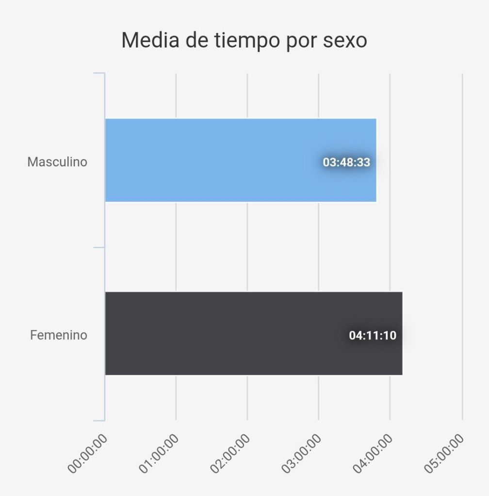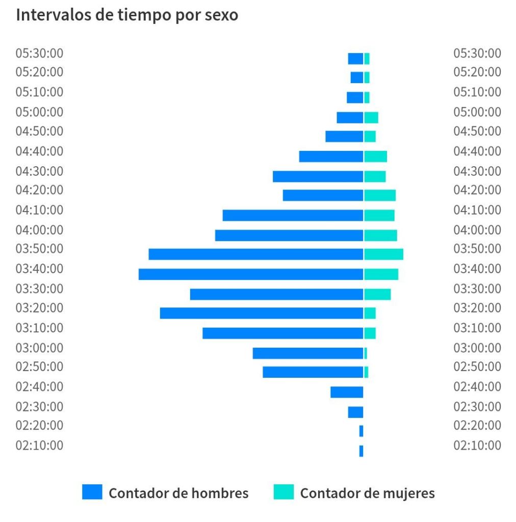 • The average finish time was just below 3h52′. For the men 3h48′, for the women 4h11′. You can also see the distribution of runners by their times by splits of 10 minutes.