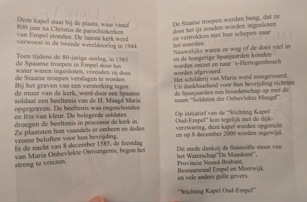 En la web de la asociación del milagro de Empel se ofrece una descripción detallada del mismo. En la página de la Wikipedia sobre el milagro de Empel se ofrece una descripción todavía más detallada. En la propia capilla hay unas cuartillas que ofrecen la siguiente explicación en neerlandés, cuya traducción incluyo debajo: