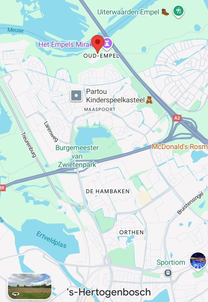 A continuación dejo un par de capturas de Google maps de la zona para visualizar la situación y una imagen del grabado de Frans Hogenberg de la Batalla de Empel.
