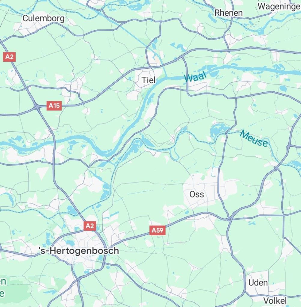 Mapa donde localizar ‘s-Hertogenbosch (Bolduque) y los ríos Waal y Mosa (Meuse en francés). La isla Bommel está entre los dos ríos al norte de Den Bosch.