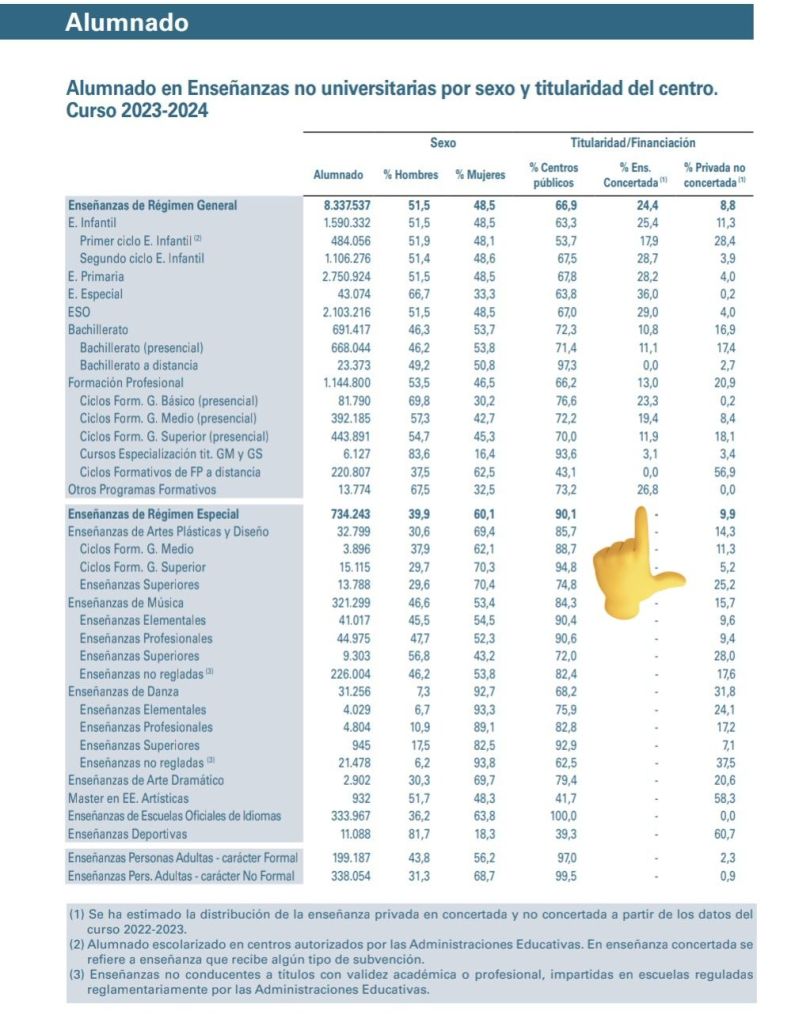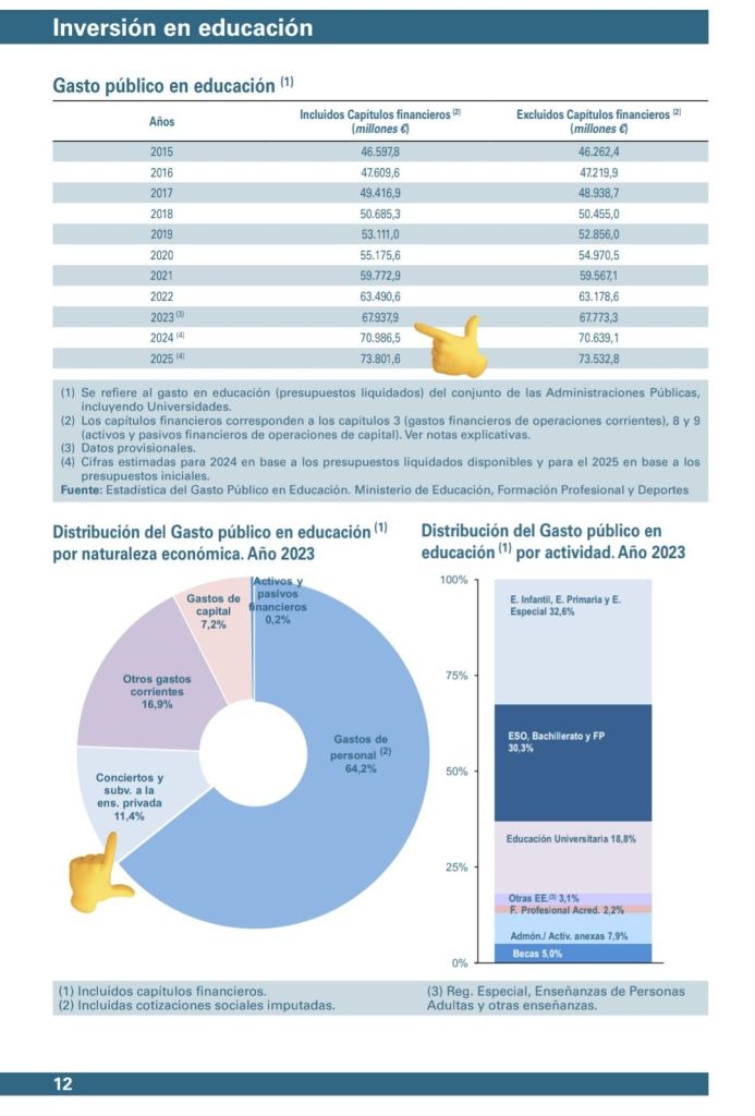 En el año 2023 se destinó a conciertos un 11,4% de un gasto en educación de 67.938m€; es decir, ~7.745m€ en conciertos.