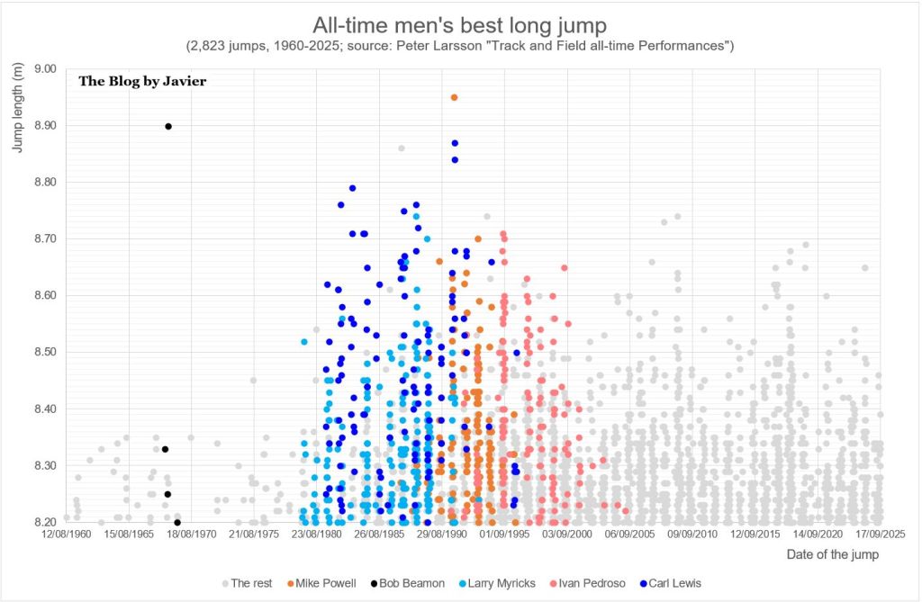 With the data of all-time men’s long jump I plotted the chart below with the best 2,823 jumps (jumps from 8.20m and longer) and their dates, highlighting the jumps made by Carl Lewis, Mike Powell, Bob Beamon, Larry Myricks and Ivan Pedroso (only taking into account “legal” jumps, i.e., those with tail winds of a maximum 2.0 m/s).