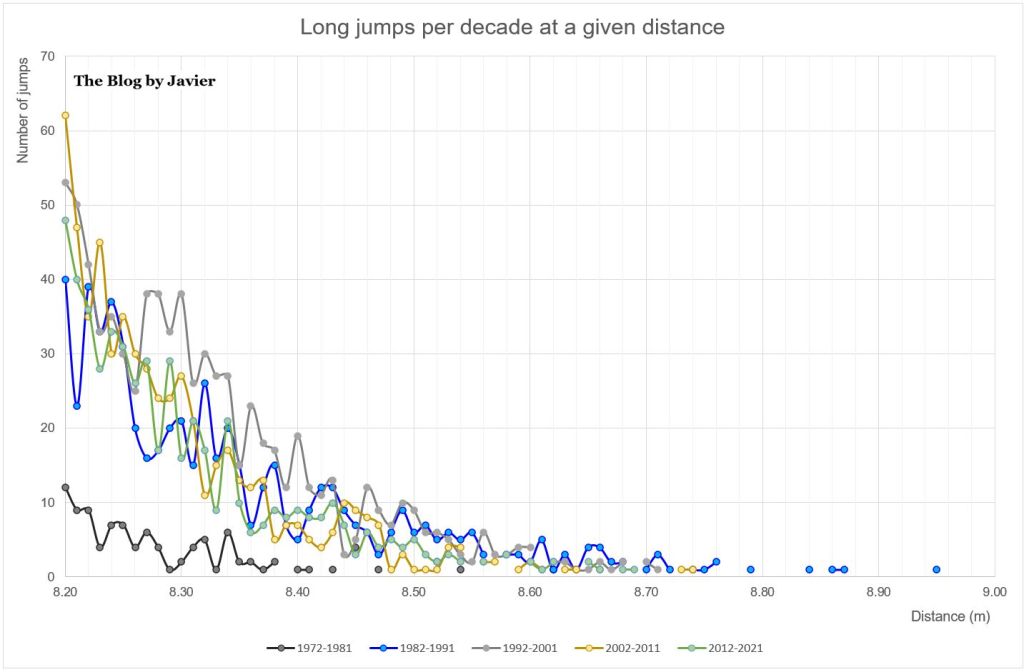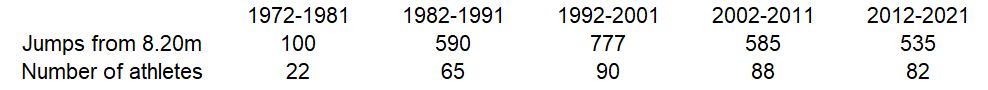 I also compiled in this table the number of jumps beyond 8.20 per decade and the number of different athletes jumping beyond that distance.