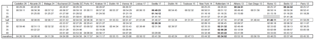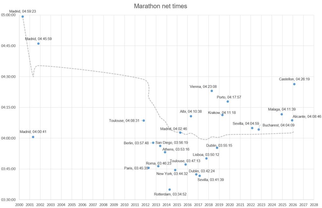 In the end, I clocked a net time of 4h26’19”, a time a bit worse than the best part of the bracket I had in mind, but as expected given the weight with which I arrived at the race and the incomplete training that I followed. This has been my 26th marathon completed, easy to say today but not so on April 30th 2000 when I started in the distance in Madrid.