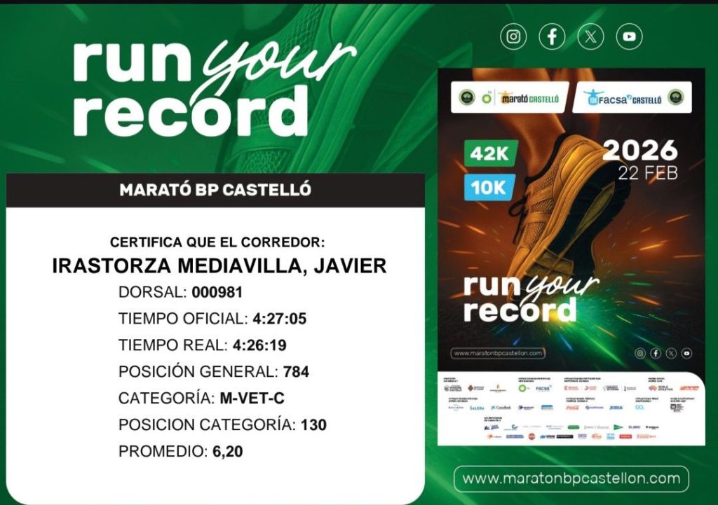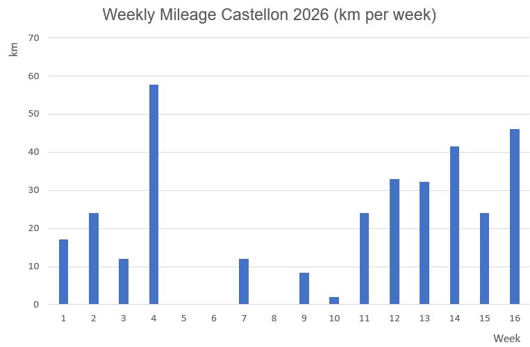 To prepare for this marathon I should have followed the same 16-week training plan I had used in the past. However, since I had previously run the marathon in Alicante, by that date we were already in the 13 weeks prior to the one in Castellón. I only ran a couple of times in December and a bit more in January, so in the end I arrived at Castellón with 292km in the legs in those 16 weeks, much less than I would have liked (barely half the training volume that I had cumulated before Alicante). I chose to skip the series training, as being overweight (96kg the day after the race), the series would hurt the tendon. I only did a couple of long runs in those 16 weeks: the 42km marathon in Alicante (November 30th) and 20km run early February. To make it even worse, just 8 days prior to the race day I had a small injury in the left calf (I suffered a similar one when preparing for Malaga in 2024), so during the last week I did not run but only did three sessions of elliptical riding.