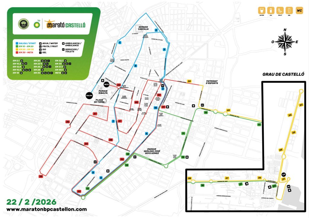 This was the 15th marathon organized in Castellón. The organization of the race was very good. They offered a wardrobe service at the gym of a school nearby, including toilets and showers. They included plenty of water supply posts (with bottles), isotonic drinks (paper cups), some food (bananas), and gels (up to three times). It was a good experience.