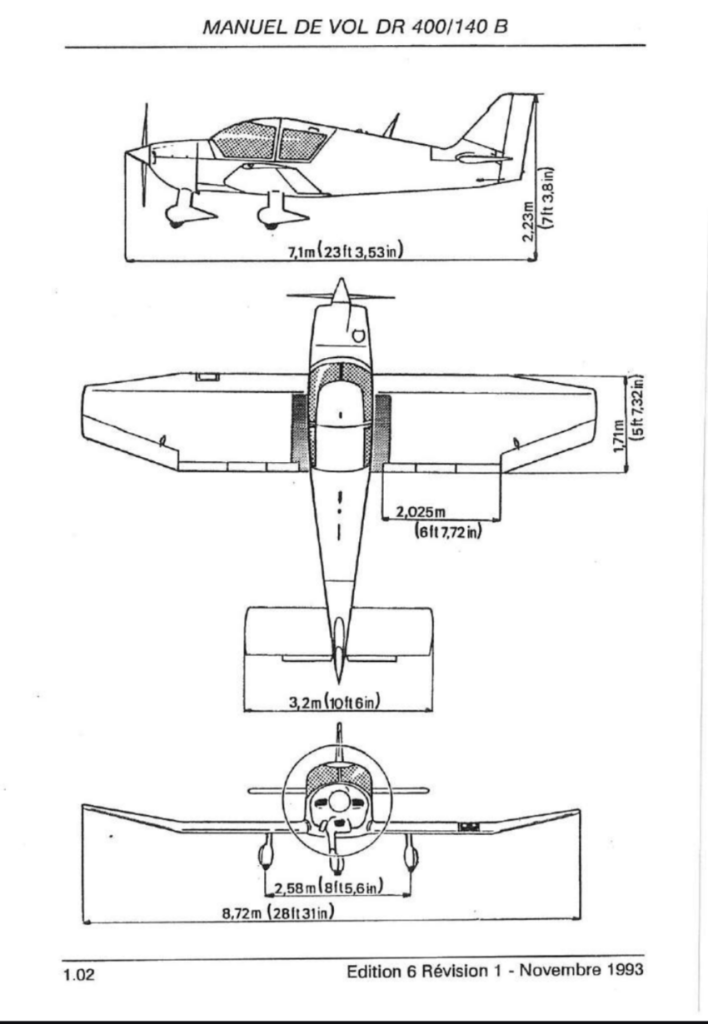 Dimensions of the DR400 as described in the Airplane Flight Manual