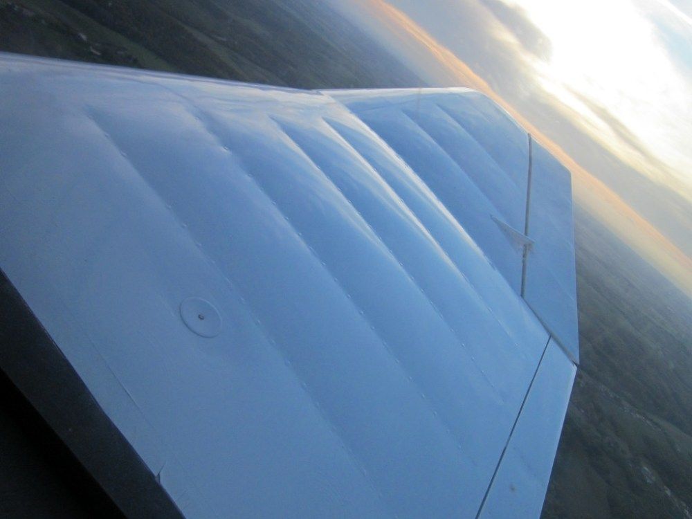 Below you can see how the wing looks in flight, with the wooden structure covered by the fabric and how the lower pressure in the upper wing pulls up the fabric of the wing.
