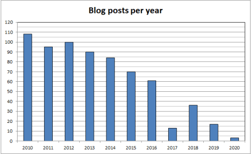 Blogging. This is the 15th year since I started the blog in 2010. This year I wrote just 7 blog posts, in line with the past years since 2020. The blog received just over 20,700 visits, a bit more than in 2023 (in line with the past few years) and over 512,000 views since 2010.