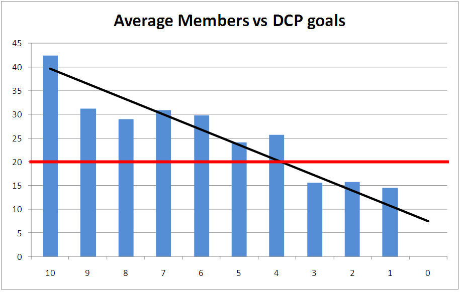 This fact is so simple that no fact-finding was needed, but I wanted to check whether there was a real difference in membership between average clubs (those meeting 4, 5, 6 goals), good clubs (achieving 7, 8, 9) and the top ones (reaching 10). And the answer is yes. Top clubs have in average over 40 members. Good ones have around 30, while average ones have around 25.