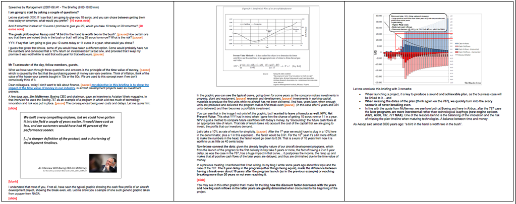 The topic of the speech is known for the reader of this blog: impact of delays in aircraft development projects seen as investment projects, the time value of money, discounting cash flows, break even, etc.