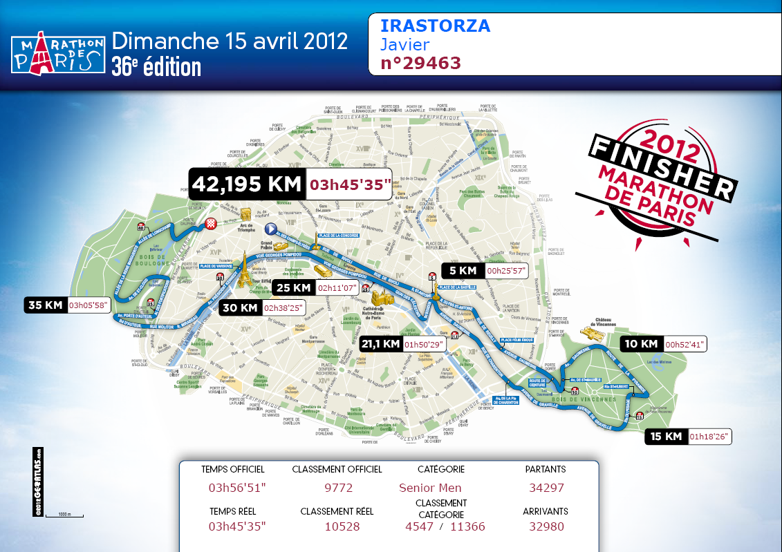 - Paris Marathon, April 15, 42.2 km, official 3:56:51, net time 3:45:35 (3:45:36). [9772/34297, 28%]