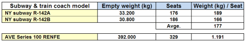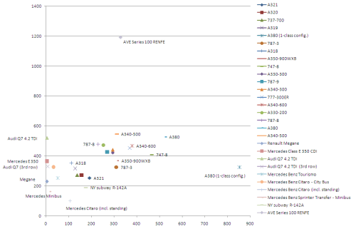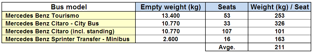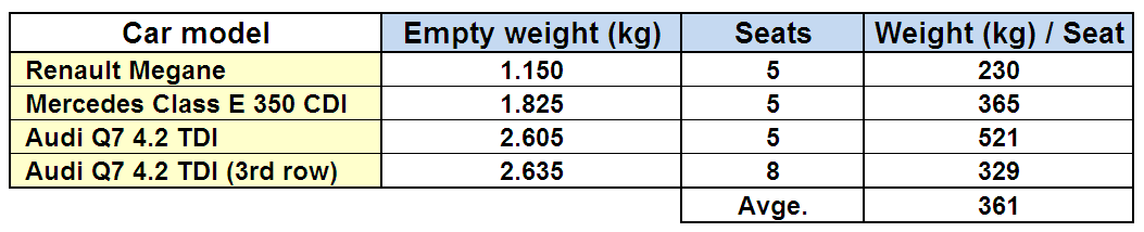 We see that the average is about 400 kg per seat. Let’s compare this figure again with cars, with the same cars as we did in the previous post. We now get following table: