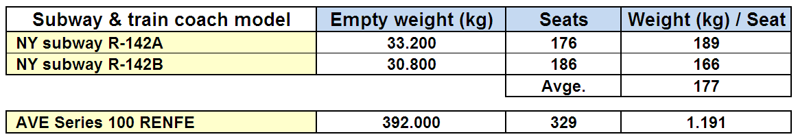 Let’s now see the train and subway. For this purpose, we’ll check the coaches R-142A and B of the subway of New York which are built by Kawasaki Heavy Industries (which a supplier for the Boeing787 as well). The train we’ll use is the AVE Series 100 of RENFE, built by Alstom, which was the first high-speed train ever used in Spain in 1992. See them in the following table: