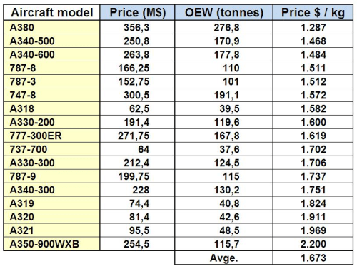 • Smaller Airbuses rank among the most expensive aircraft in a per kg basis despite the suggested price war that was reported by the specialized press in the recent years.