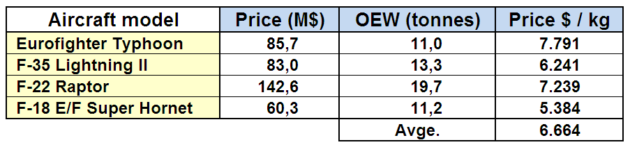 Now that we have an idea of how much aircraft cost per kg (1,700$ commercial aircraft, 2,100$ military transport aircraft and 6,700$ fighter aircraft)… is this expensive? Expensive compare to what?