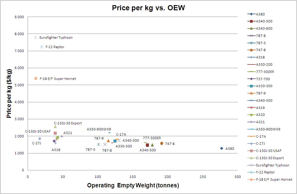 With the exceptions of A350-900 and 787-9 there seems to be a very slight trend in bigger aircraft being cheaper in this per kg basis. One may argue that once the frame of a certain size is built, building a bigger one might not cost that much