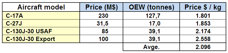 As you can see, military transport aircraft are on average 25% more expensive on a per kg basis. There is much more technology in them than people tends to think… they are clearly not just flying trucks.