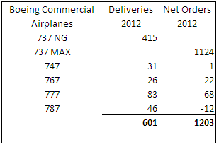 A week ago, Boeing released 2012 results [PDF, 223KB]. The company reported revenues of almost 81.7bn$601 commercial deliveries and 1,203 net orders for its commercial aircraft. All these were widely reported by the media and mean a great year 2012 for Boeing (with increases in these metrics from 20 to 30%).