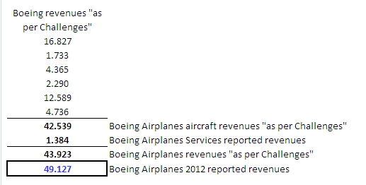 Having put all the figures together, the calculation is immediate. Boeing Commercial Aircraft revenues in 2012 (49,1bn$) are the sum of: