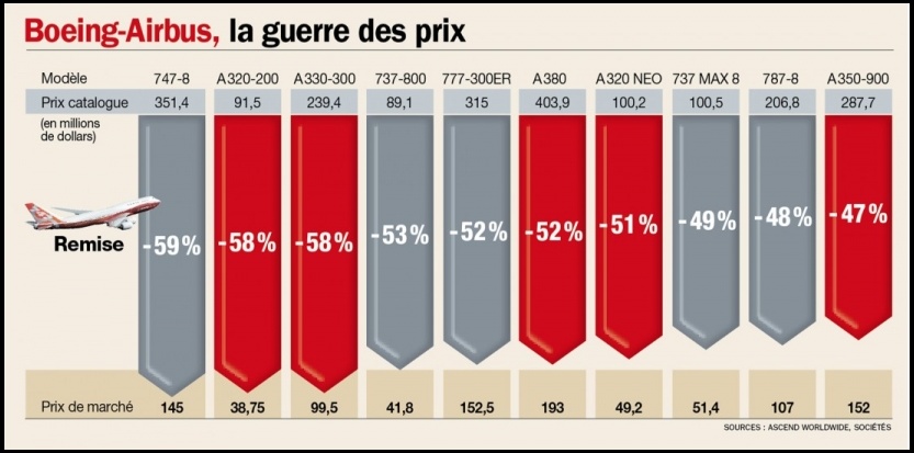 Last week, ahead of the start of the Le Bourget air show, the French portal Challenges.fr, published an article “Le vrai prix des avions d’Airbus et de Boeing” with an interesting graphic showing a comparison of the prices after discounts of commercial aircraft both of Boeing and Airbus.