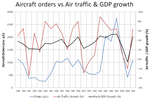 Boeing publishes in its website the number of aircraft ordered each year. For this exercise, I took into account the net orders in the year of order.