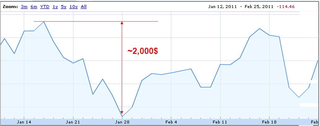 Since a picture is worth a thousand words, I wanted to share a snapshot of the swings of our “J&L” ( 😉 ) portfolio in the past few weeks. One could read the picture as “you have lost 114$ in the past weeks”. That same person on January 28th would have said “you’ve lost 2,000$ in the last 10 days”.
